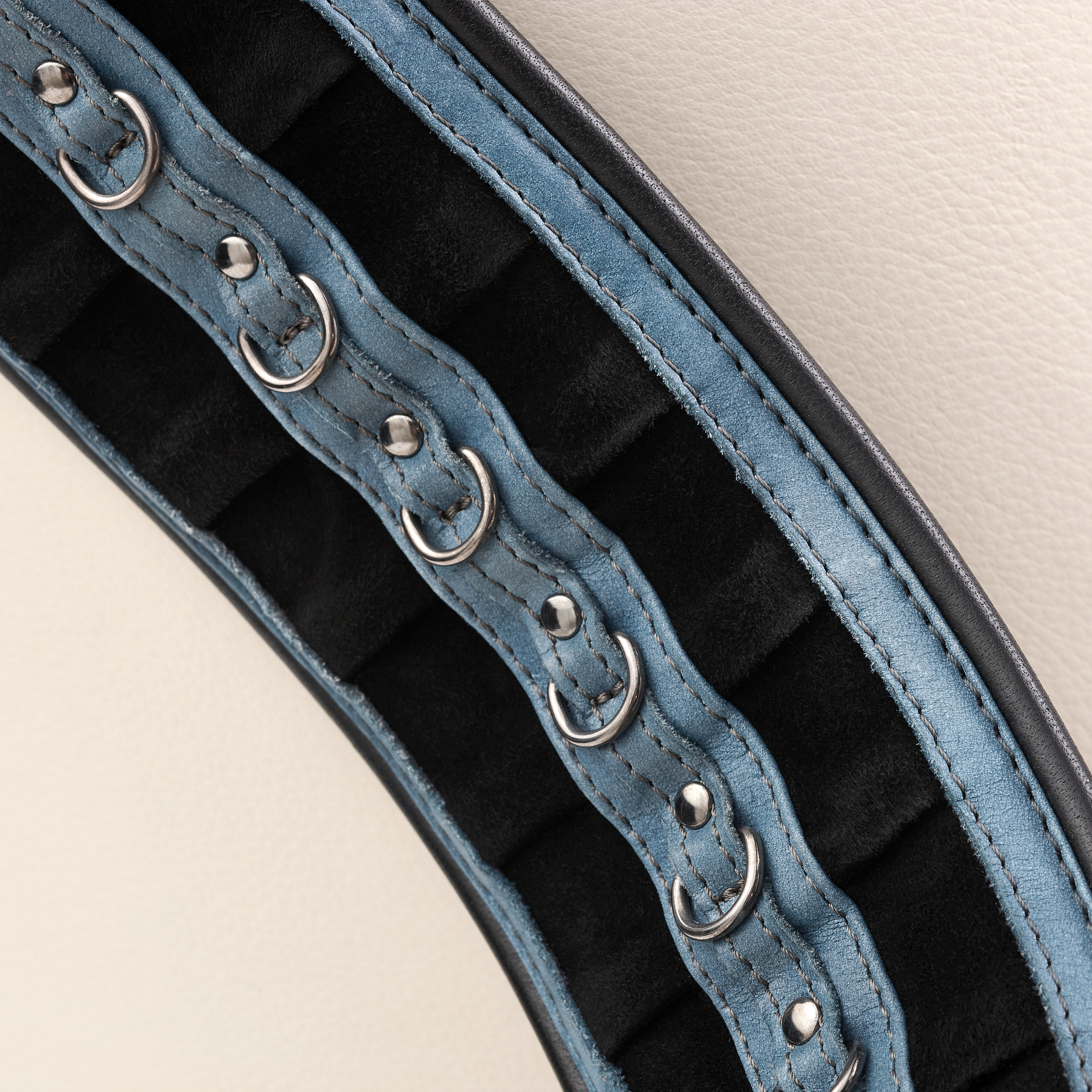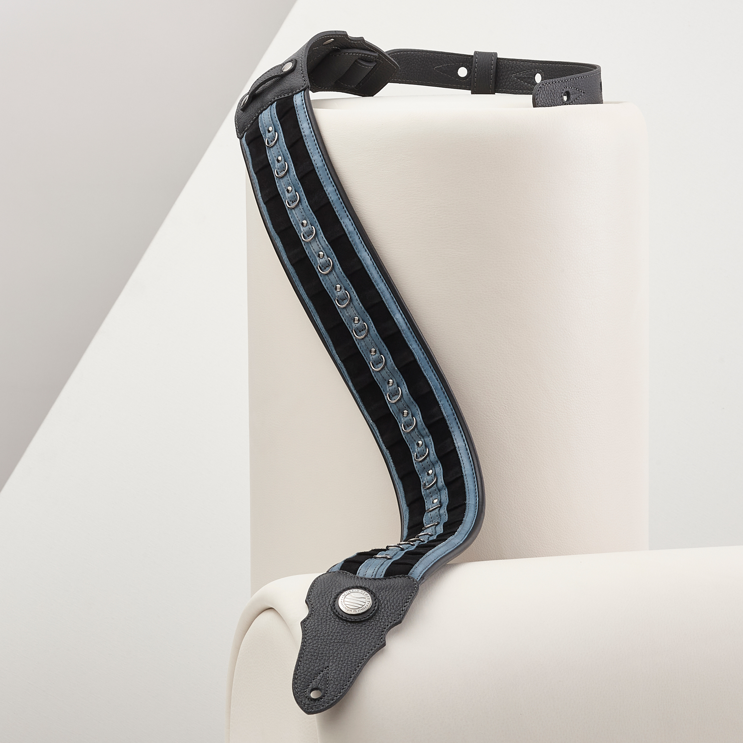 Tomaia plissettata in pelle di vitello scamosciata nera dall’effetto tridimensionale, bordata ai lati da fasce in vitello ripiegato color azzurro ceruleo, tamponato e scolorito a mano, in nota vintage. Decorazioni centrali realizzate con anelli passanti e borchie piatte. Tomaia anteriore in vitello grinzoso nero e accessorio logo. Passanti con borchie e asole di regolazione sulla tomaia posteriore, codino a fori entrambi in vitello grinzoso nero. Tutti gli accessori illuminati in superficie dalla rifinitura nichel nero lucido. Cuciture acciaio scuro.