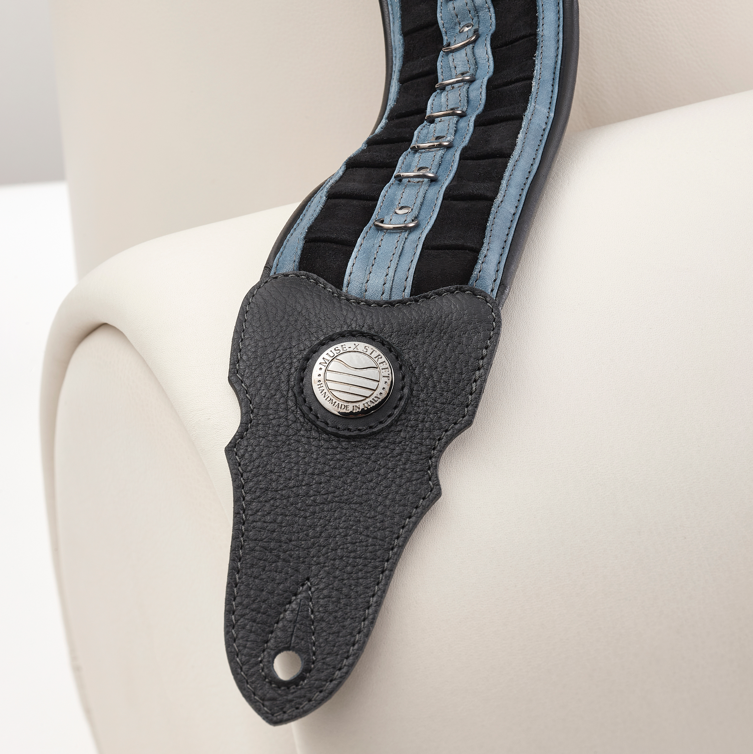 La pelle inferiore è ripiegata sopra l’imbottitura, creando una zona davvero confortevole tra spalla e collo. Inoltre è una pelle speciale, scelta non solo per il suo aspetto, ma anche per la sua aderenza, che aiuta a mantenere lo strumento in posizione.