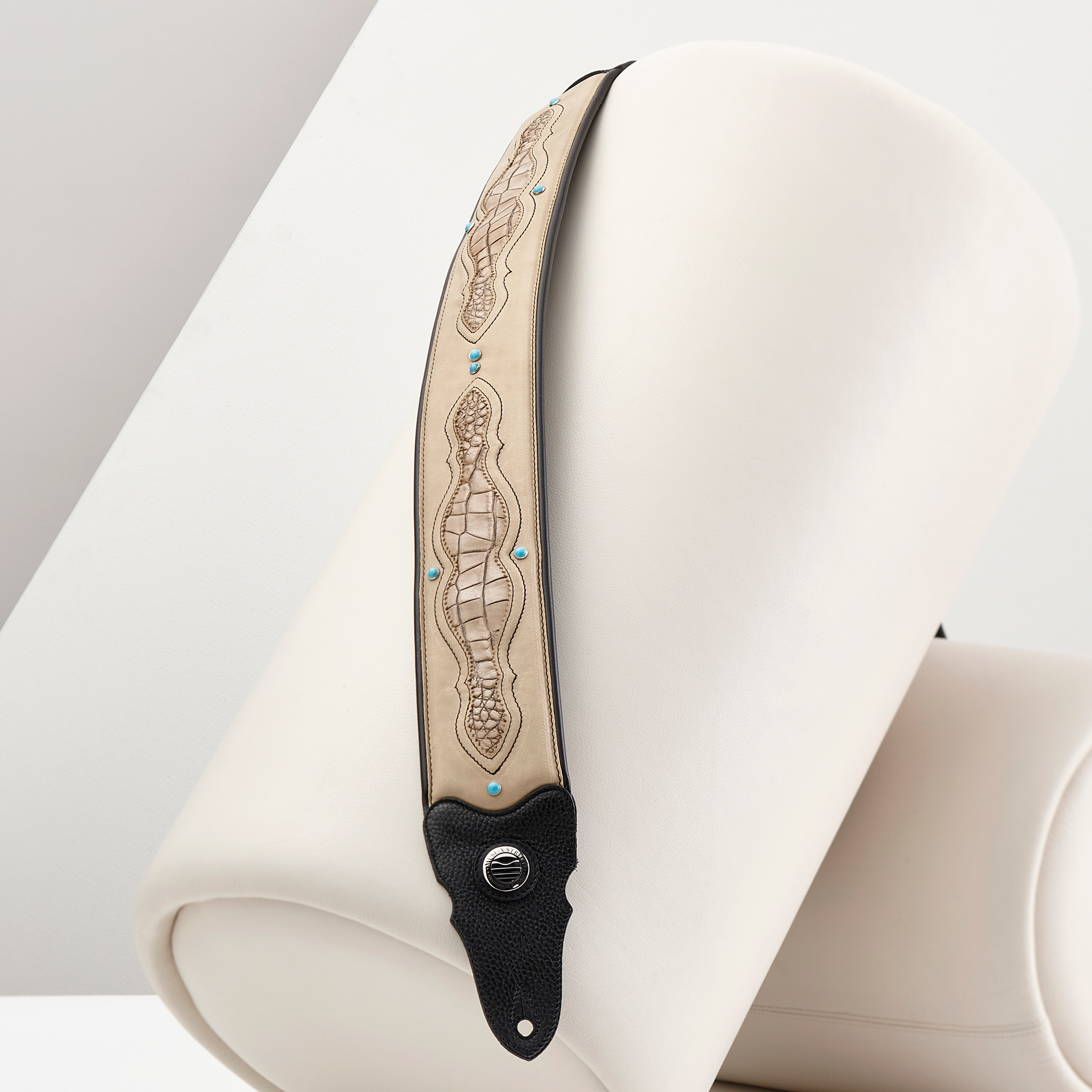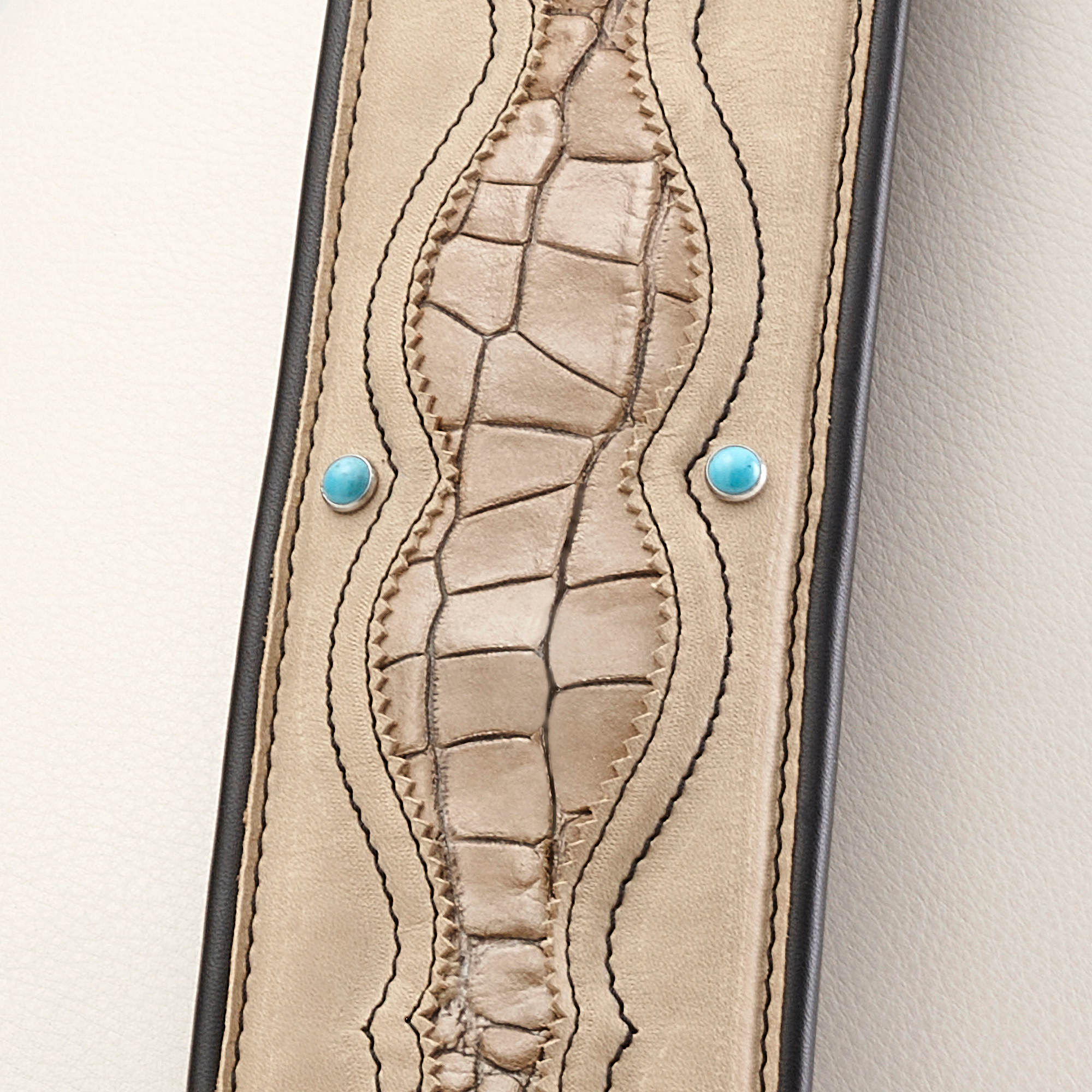 Pelle di vitello tinta sabbia caratterizzata da una texture opaca e disomogenea, resa tale in fase di rifinitura tramite l’impiego di specifiche cere. Nei punti di maggior contatto il pellame tende ad inscurirsi ed a lucidarsi, accogliendo su di sé i segni del passare del tempo. Ricchi decori smerlati creano una cornice attorno alla pelle di vitello tinta sabbia accuratamente tamponata a mano con stampa rilievo effetto coccodrillo. Borchie cabochon turchese e cuciture nere a contrasto. Tomaia anteriore in vitello grinzoso nero e accessorio logo. Passanti con borchie e asole di regolazione sulla tomaia posteriore, codino a fori entrambi in vitello grinzoso nero. Tutti gli accessori illuminati in superficie dalla rifinitura nichel lucido.
