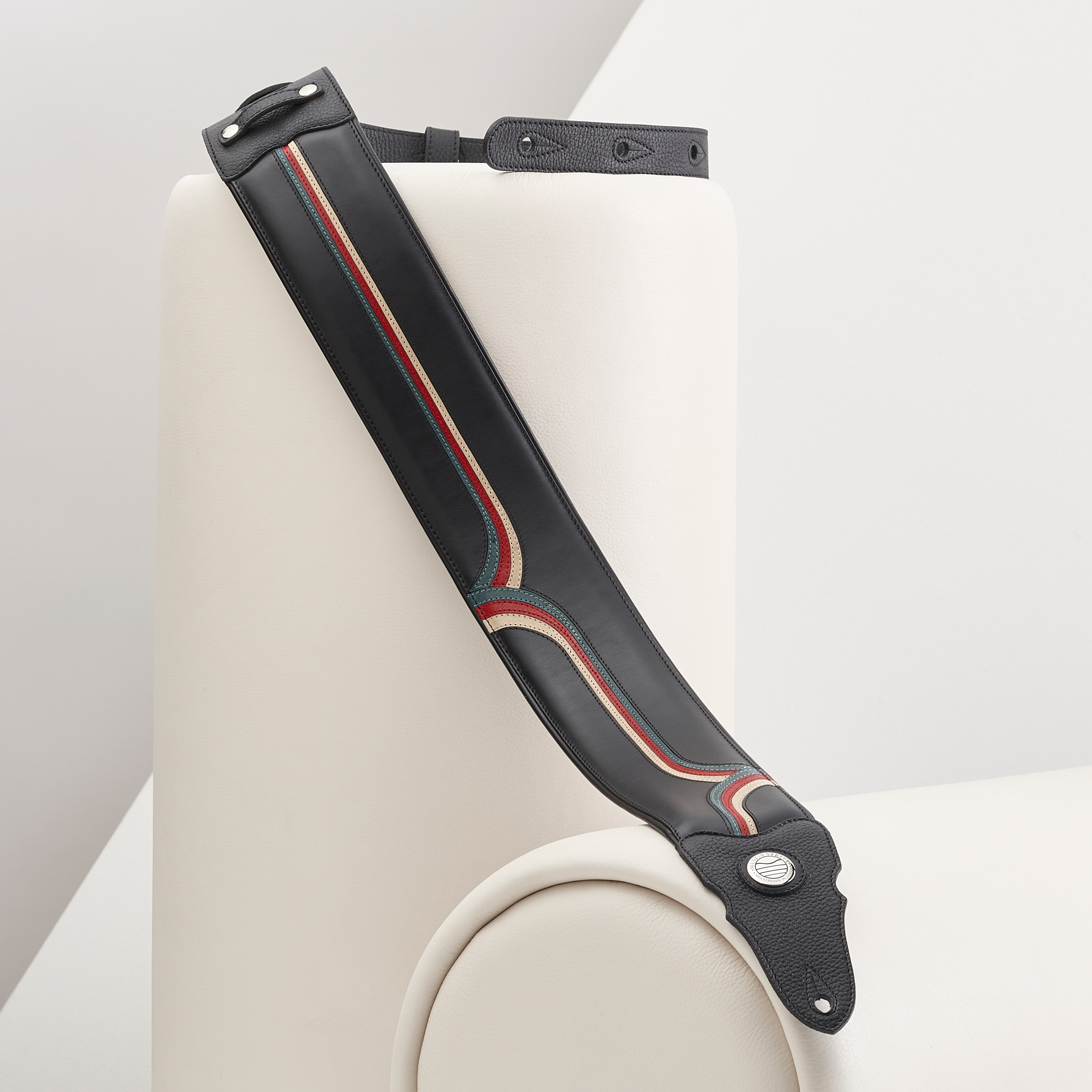 La pelle inferiore è ripiegata sopra l’imbottitura, creando una zona davvero confortevole tra spalla e collo. Inoltre è una pelle speciale, scelta non solo per il suo aspetto, ma anche per la sua aderenza, che aiuta a mantenere lo strumento in posizione.
