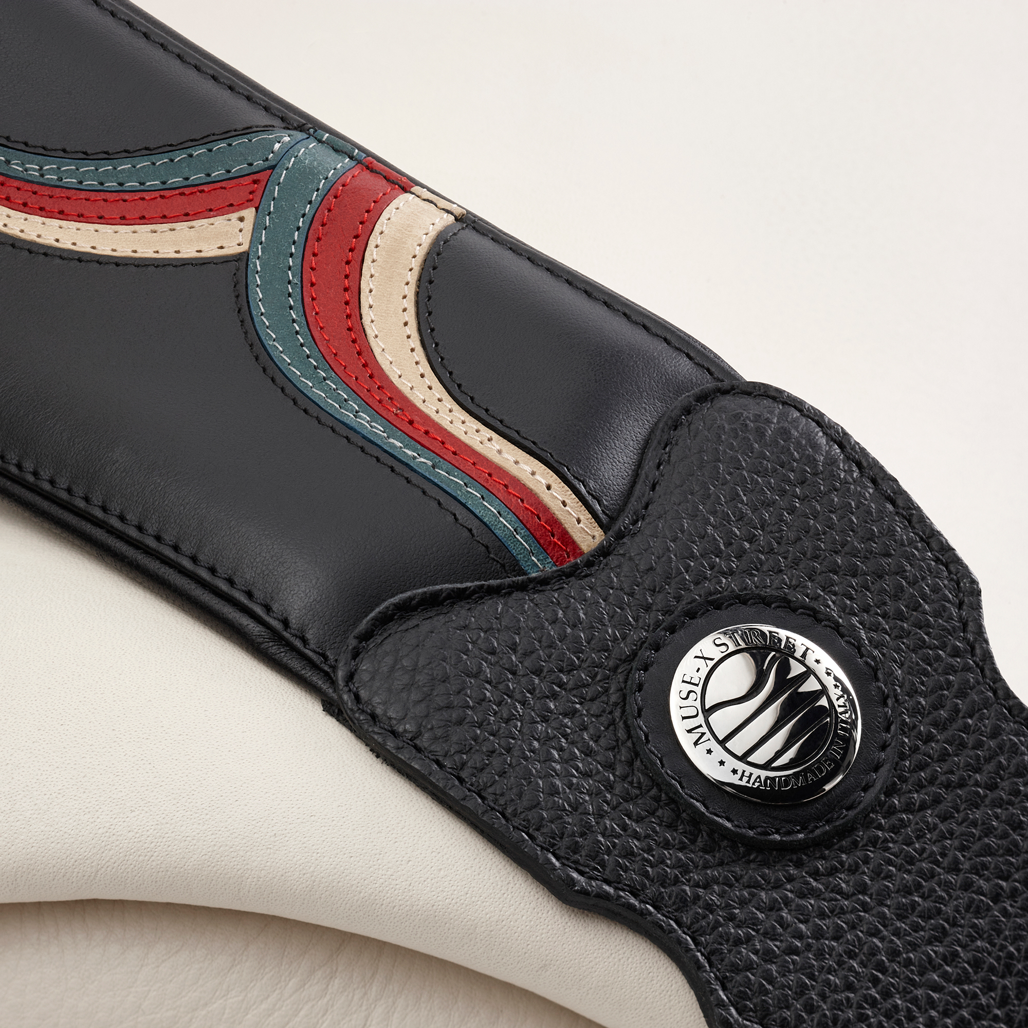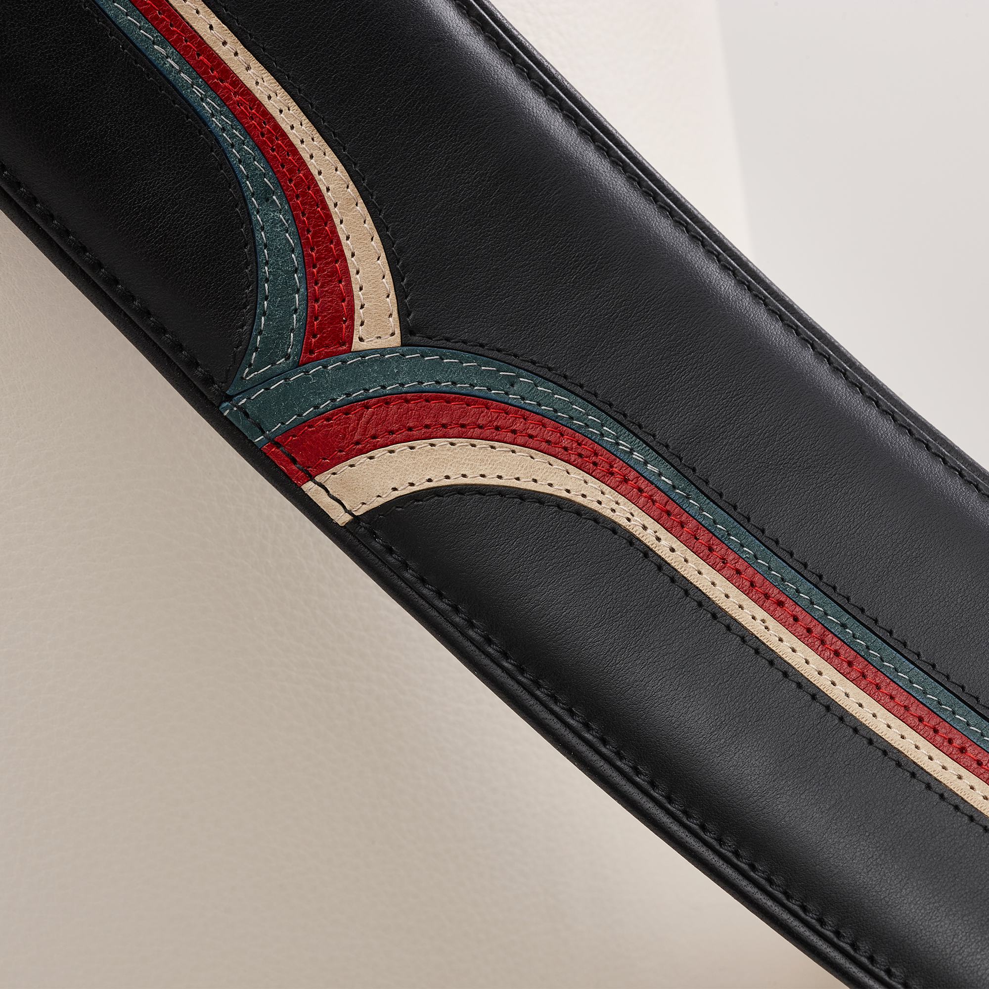 Tomaia ripiegata in vitello nero, arricchita dall’effetto perlato, fa da sfondo ad una decorazione a tema ondulato, realizzato tramite il preciso accostamento di diversi pellami di vitello dalle tinte azzurro ceruleo, rosso antico e sabbia. Tomaia anteriore in vitello grinzoso nero e accessorio logo. Cuciture in tono al pellame. Passanti con borchie e asole di regolazione sulla tomaia posteriore, codino a fori entrambi in vitello grinzoso nero. Tutti gli accessori illuminati in superficie dalla rifinitura nichel lucido.