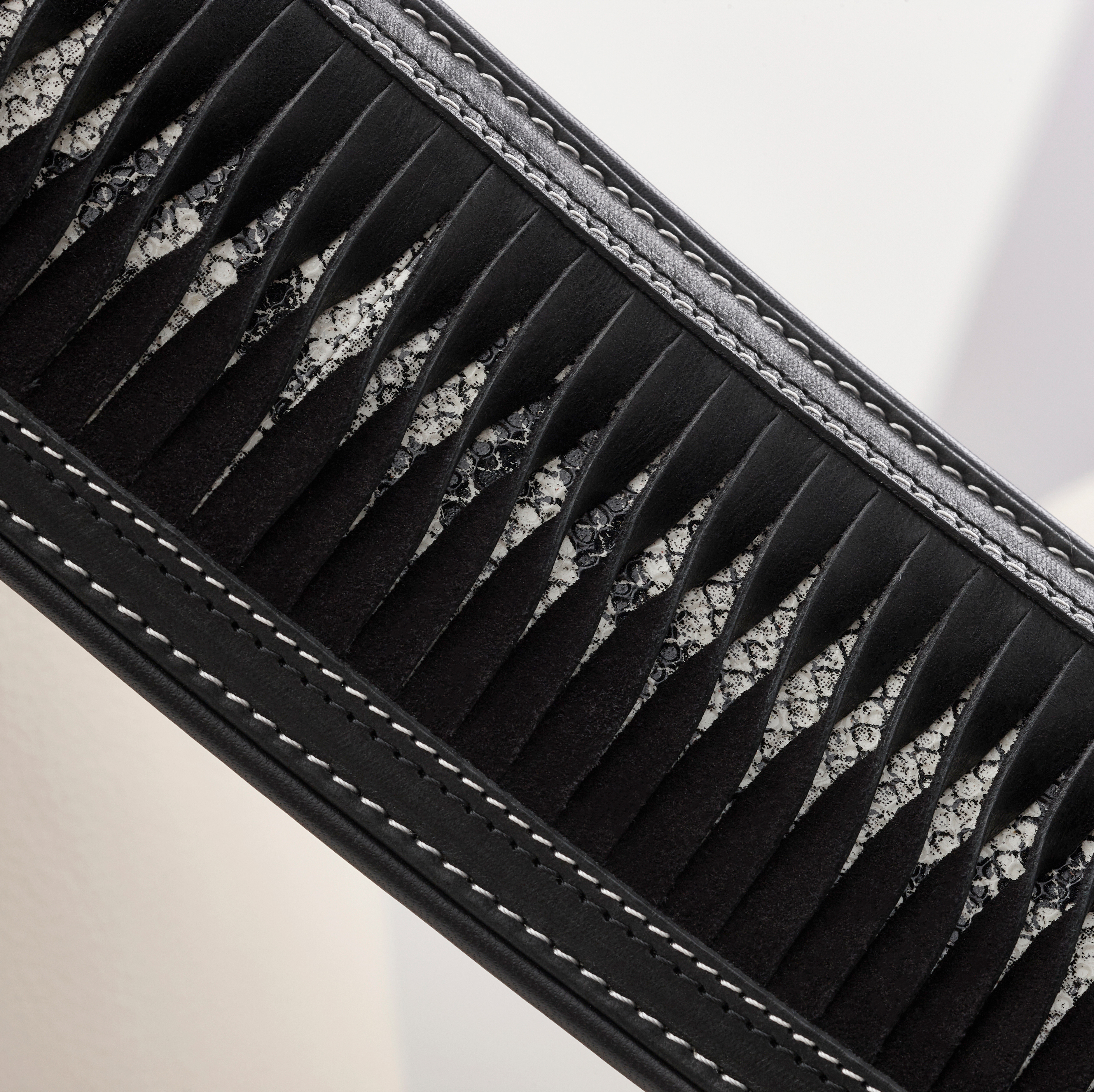 Tomaia ripiegata in vitello nero ed opaco, dall’effetto démodé. Superficie lavorata con cere ad esaltarne anche la disomogeneità. Al centro decoro a spirali orizzontali composto da strisce realizzate tramite l’accostamento di due diversi tipi di pelle: vintage semi-lucida nera e scamosciata nera opaca. La lavorazione tridimensionale crea un effetto optical dall’impatto incisivo. Al di sotto, a contrasto, pelle stampa pitone a rilievo color bianco luminoso. Presenti cuciture nere e acciaio. Tomaia anteriore in vitello grinzoso nero e accessorio logo. Passanti con borchie e asole di regolazione sulla tomaia posteriore, codino a fori entrambi in vitello grinzoso nero. Tutti gli accessori metallici illuminati in superficie dalla rifinitura nichel lucido.